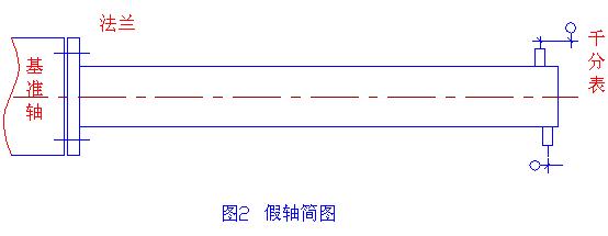 本机组是某化工厂14000m3/h大型空分装置配套机组,它的作用是为空分装置提供原料空气。电机采用同步电机,其转速为3000r/min。该机组是由沈阳鼓风机厂制造的。其结构简图如图1,电机是通过一个长2490mm的齿式联轴器向压缩机传输扭矩。为方便机组与联轴器的对中,厂家随机配备联轴器对中的专用工具,称之为假轴(图2)。它是一个一端焊接法兰的无缝钢管,使用时假轴通过法兰与基准轴相联接,另一端架表来调整电机主轴与压缩机主轴的对中。考虑到假轴与基准轴连接后是一个一端固支的悬臂梁,厂家在假轴上给了一个挠度值(f=1.3mm)。