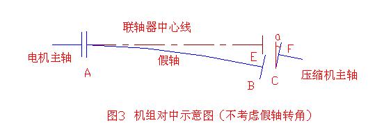 在本例中,由于电机与压缩机之间有一很长的联轴器,它的对中是通过将假轴一端装在基准轴(电机轴)上来找正压缩机主轴的对中。当把假轴装到基准轴上,假轴另一端架百分表对压缩机主轴找正时,考虑了由于假轴的挠度而产生的误差,而忽视了假轴B端旋转平面与A端主轴端面有一个角度a,如图3所示,当找正完成后,存在A、C平面端面误差变大,也即AC平面有一个a角度。因此当取下假轴装上联轴器后会出现电机主轴端面与压缩机电机主轴端面事实上的上开口。造成端面误差变大。