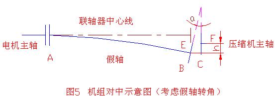 即端面跳动下部比上部多一个Δx值。考虑图3的偏差形式:两轴心线既有倾斜又有偏移。在对中时增加了转角的内容,调节压缩机主轴端面与假轴端面,使其上轴向比下轴向小0.21mm左右,即形成两端面有一个角度,且角度开口方向是向下的,根据上面的计算这个角度大约是a角。考虑到机组的温度补偿,调节使压缩机主轴向上偏移h值,这样就保证了压缩机主轴与基准轴(电机主轴)的径向跳动度和轴向偏差要求,如图5。